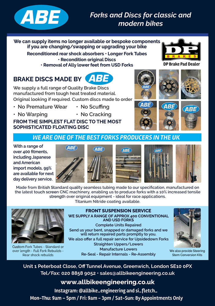 We at ABE have been manufacturing motorcycle brake discs and fork tubes since 1982. Our range of parts are available for most common bikes in the UK however we can manufacture custom tubes and discs to suit your individual vehicle, plus we can refurbish, rechrome fork tubes and undertake suspension rebuilds. We are also able to offer a number of other services too from MOT prep to Tyre fitting, plus we offer a convenient 24 hour bike recovery service if you need it, for a minimum charge is £50.
