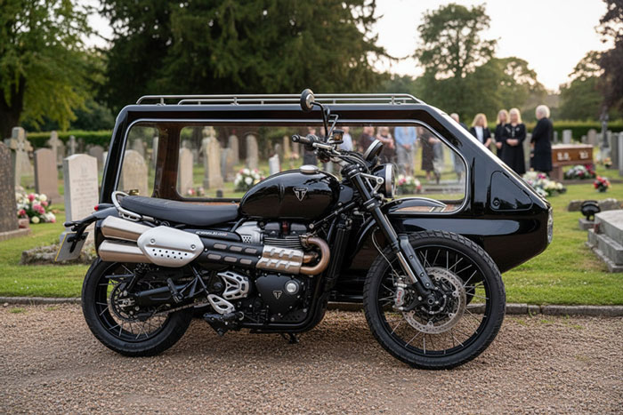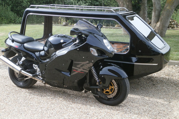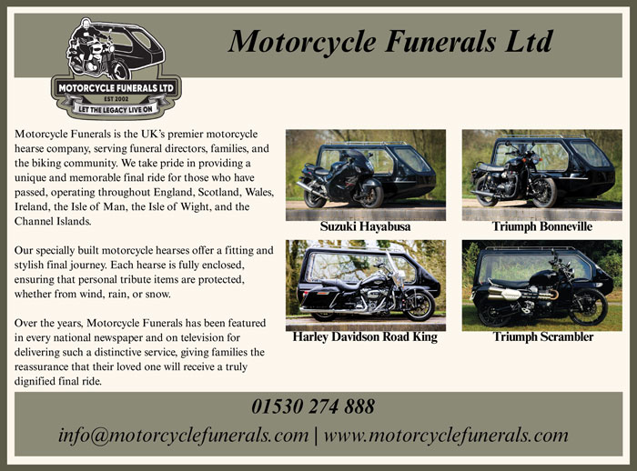 We at Motorcycle Funerals are the UKโs Premier Motorcycle Hearse company serving Funeral Directors, Families and the Biking Community. We are able to provide a unique and memorable final ride for your loved one, using our fleet of specially-built hearses. As most of our hearses are fully enclosed, they will protect flowers and personal tribute items from the wind, rain and snow. We are able to serve the whole of the UK including England, Scotland, Wales, Ireland, Isle of Man, Isle of White and the Channel Islands.